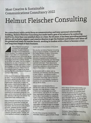 - European Business Award (most creative & sustainable communications consultancy 2022) und Nominierung 2023, German Business Award 2024